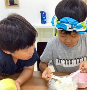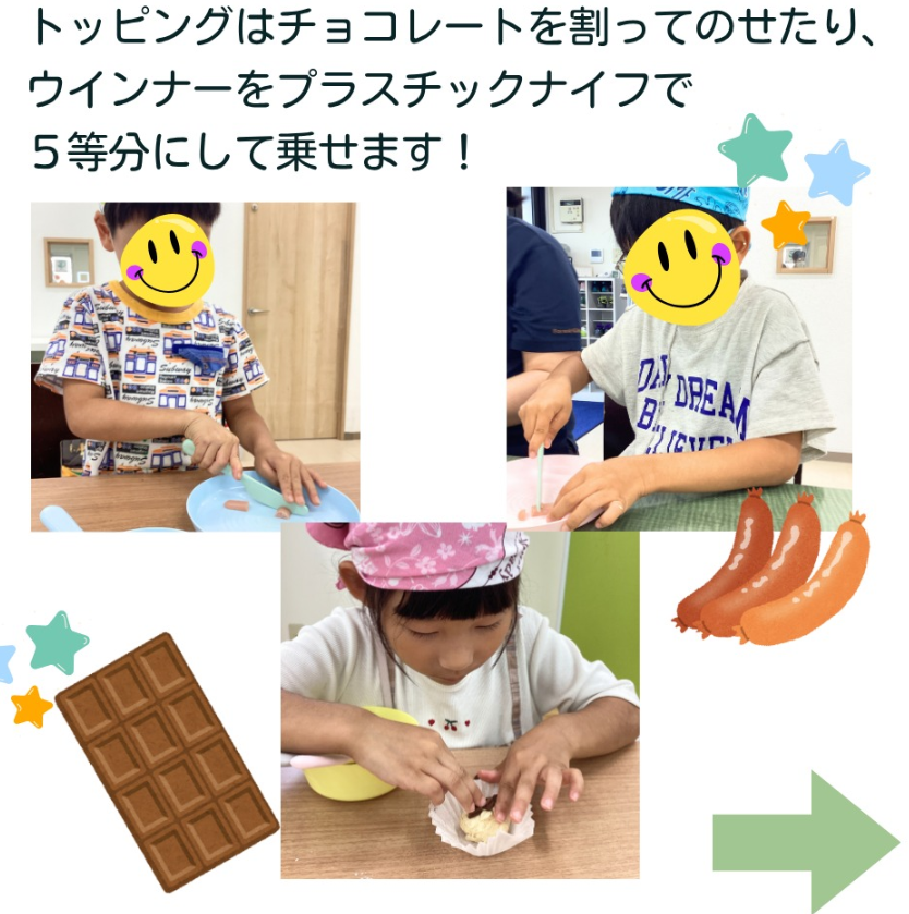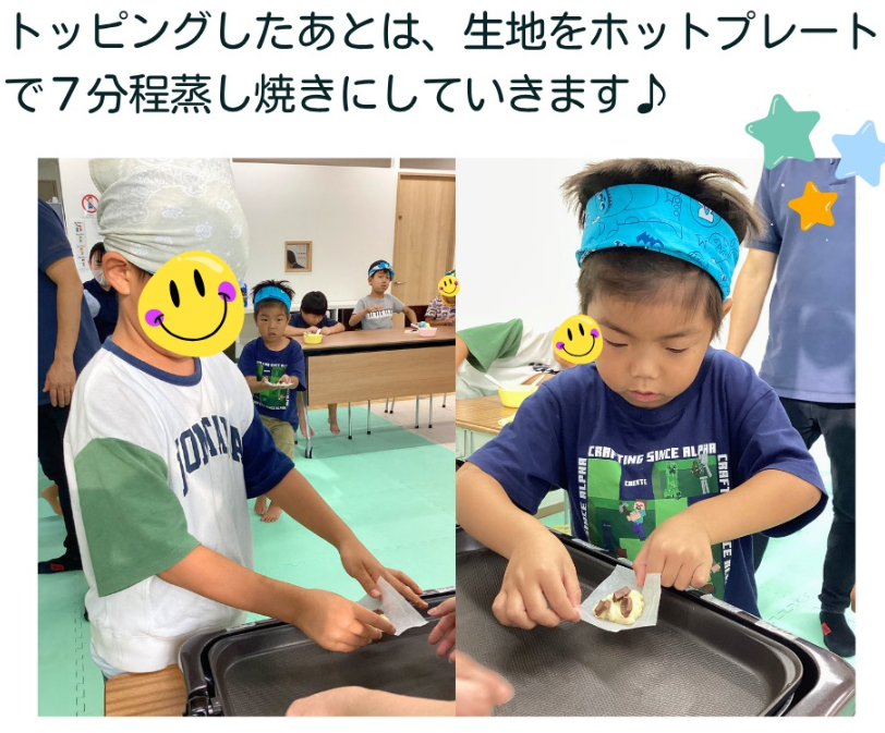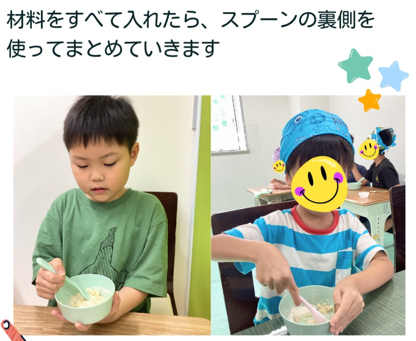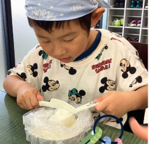 説明を聞いて取り組むだけではなく、材料を計って混ぜたり、「多いかな?もう少し減らそう」と、量の違いを目で見て感じたり、ふわふわの感触を確かめたり、「いいにおい♡」「おいしいね♪」と五感を使っておやつ作りを楽しみました。